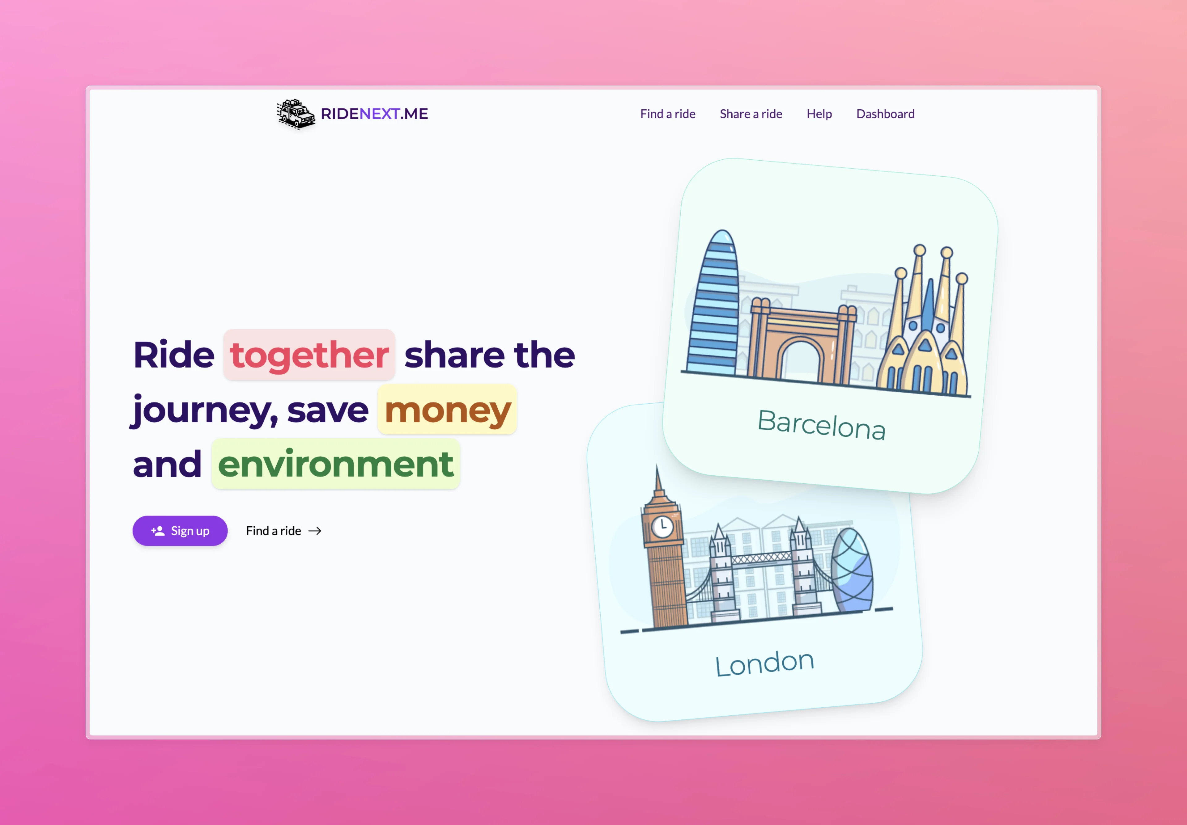 Ride Next wurde erstellt um Verkehrsüberlastung zu reduzieren und die Umwelt zu schonen. Die App ermöglicht es Benutzern, Mitfahrgelegenheiten zu finden und zu erstellen. Als eine PWA (Progressive Web App) bietet Ride Next Echtzeit-Chat, Push-Mitteilungen und vieles mehr.